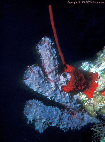 A pale purple Spicule Sponge (Callyspongia vaginalis,) covered with Brittlestars. At the base is a Red Finger Sponge and a Red Cup Sponge. Jackson Bay, Little Cayman Island - 60 feet or 18 meters |