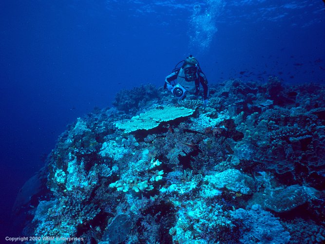 A scuba diver picks his way across the top of the great mound of hard corals at the edge of a dropoff. Astrolabe Reef, Kadavu, Fiji - Depth 35 feet or 11 meters